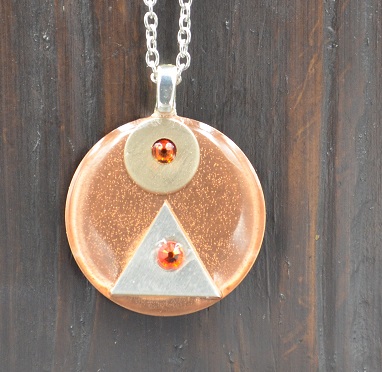 An Art Deco inspired piece was made using a copper circle and an aluminum triangle and circle. In the center of each smaller shape is a Swarovski fire crystal. This hangs with a silver plated bail and chain.