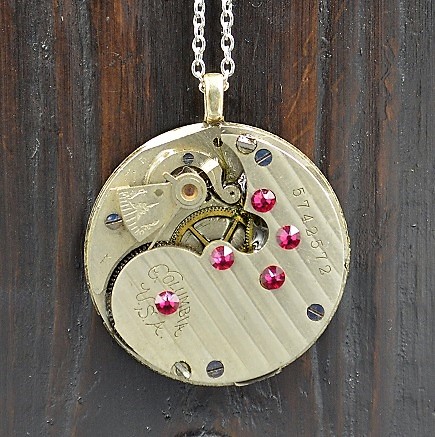 This is an antique watch movement made by the Columbia Watch Company in 1896. This movement has 5 Magenta colored Swarovski crystals attached to the top and a coat of resin and silver plated bail on the back. This hangs with a silver plated chain.