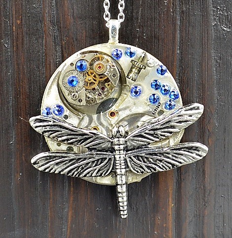 An antique pocket watch movement plate, has a smaller watch movement attached in the upper left corner. There is a metal dragonfly attached to the bottom and thirteen blue Swarovski crystals have been attached to the top. There is a silver plated bail on the back and a silver plated chain.