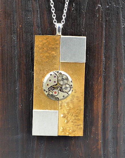 This is a necklace made by taking two strips of brass and hammered them by hand on only two sides. A square of aluminum was attached to the other sides and this was joined together, in a familiar Art Deco style. A single, small, antique watch movement was placed in the center. This hangs with a silver plated bail on the back and a silver plated chain.