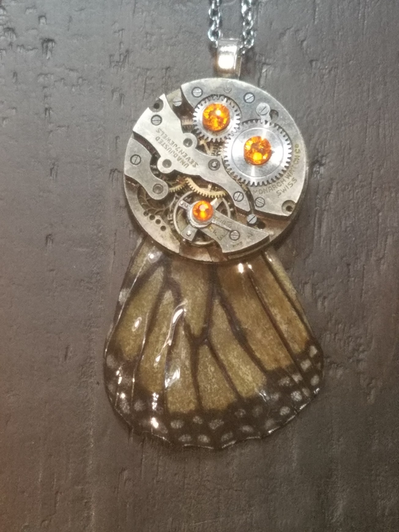 The movement of the watch, is labeled as the “Monarch Watch” but most likely was a small brand used to bring in Swiss made watches, into America, for another seller’s company. The style looks like early 1900’s. This has been paired with a resin-coated Monarch butterfly wing. There are 3, orange, Swarovski crystals attached to the top of the movement. This has a silver plated bail on the back.