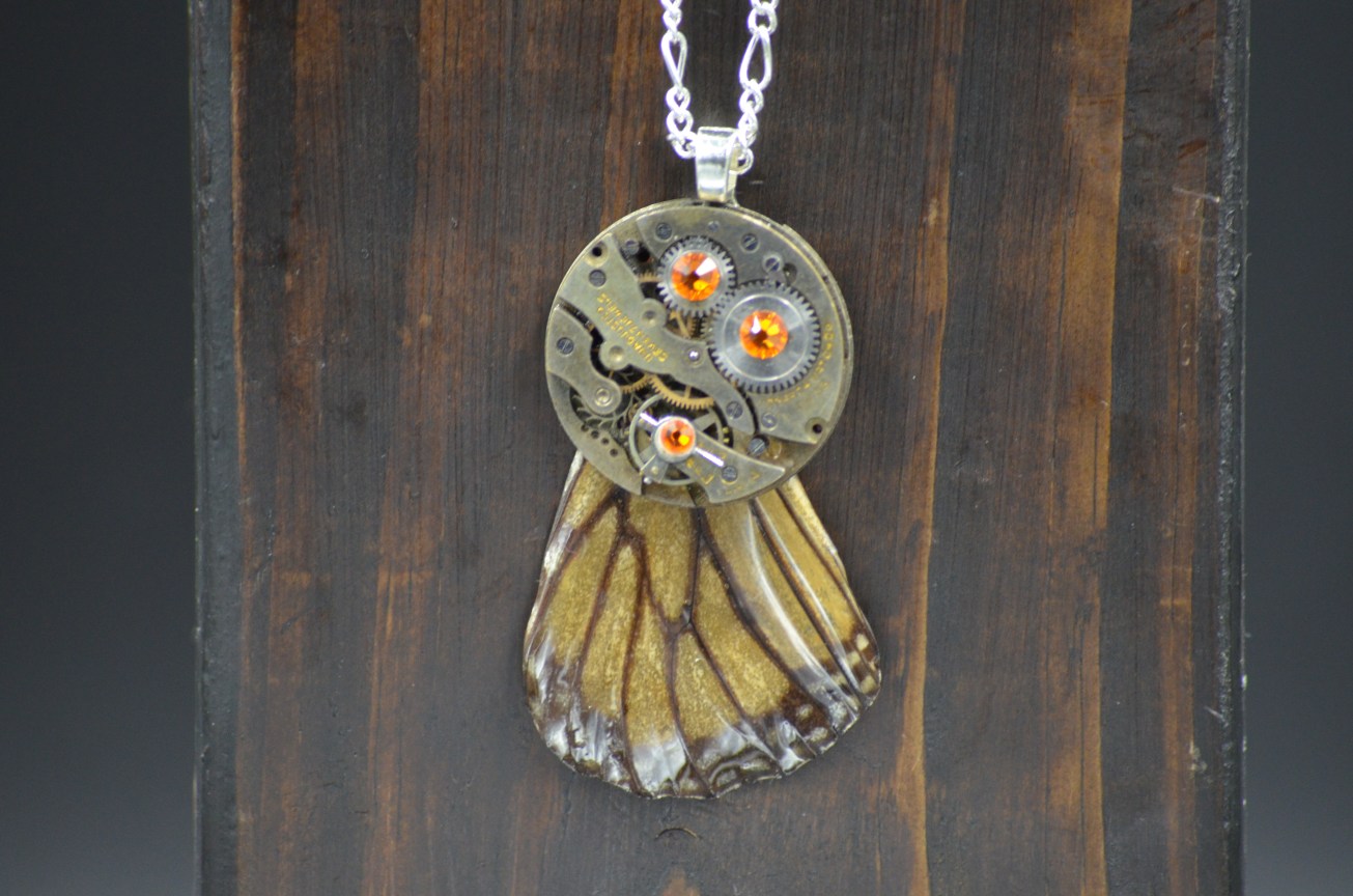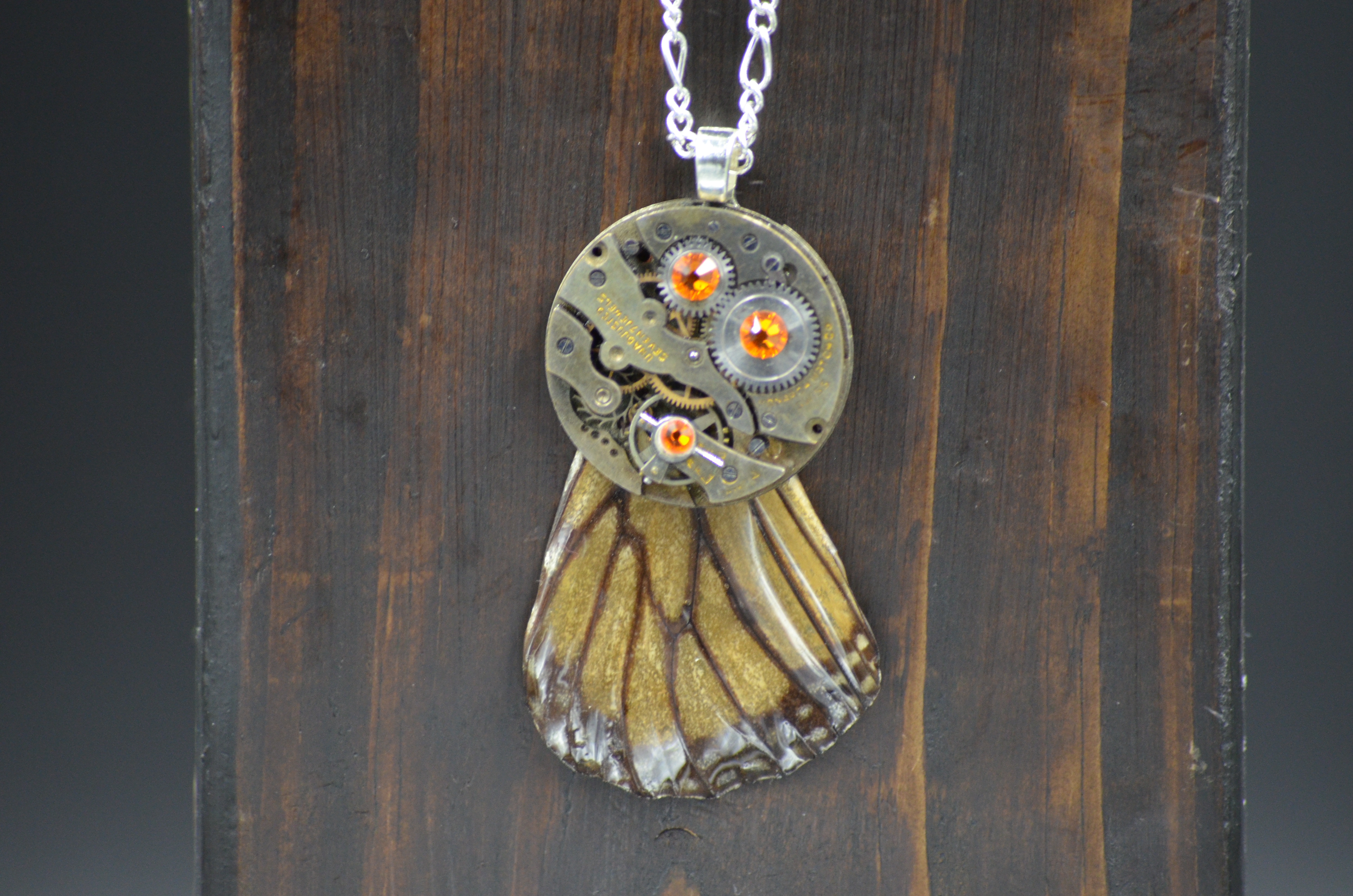 A watch movement made by the Monarch Watch Company in the 1950’s most likely is attached to a resin coated Monarch butterfly wing. There are three orange colored Swarovski crystals attached to the top of the watch movement. This hangs with a silver plated bail and chain.