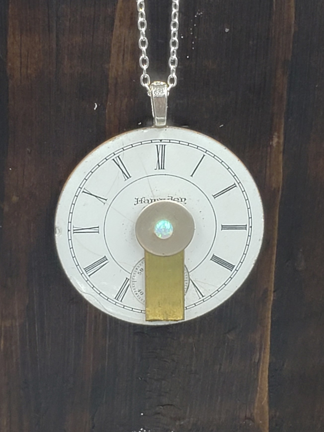 Next Previous Hampton Dial with Brass Aluminum and Opal by antiquariancouture March 13, 2024 All Jewelry, Pendants, Uncategorized antique, brass, dial, hampton, industrial, necklace, opal, pendant, steam punk, steampunk, Victorian, vintage, watch An antique pocket watch dial from the Hampton Watch Company has a brass rectangle attached to the bottom and middle of it. There is an aluminum circle with a single opal in the center. This has a silver-plated bail and chain. Share this: Click to share on X (Opens in new window) X More Click to share on Nextdoor (Opens in new window) Nextdoor Click to share on Facebook (Opens in new window) Facebook Click to share on Bluesky (Opens in new window) Bluesky Click to share on Threads (Opens in new window) Threads Like Loading... Related
