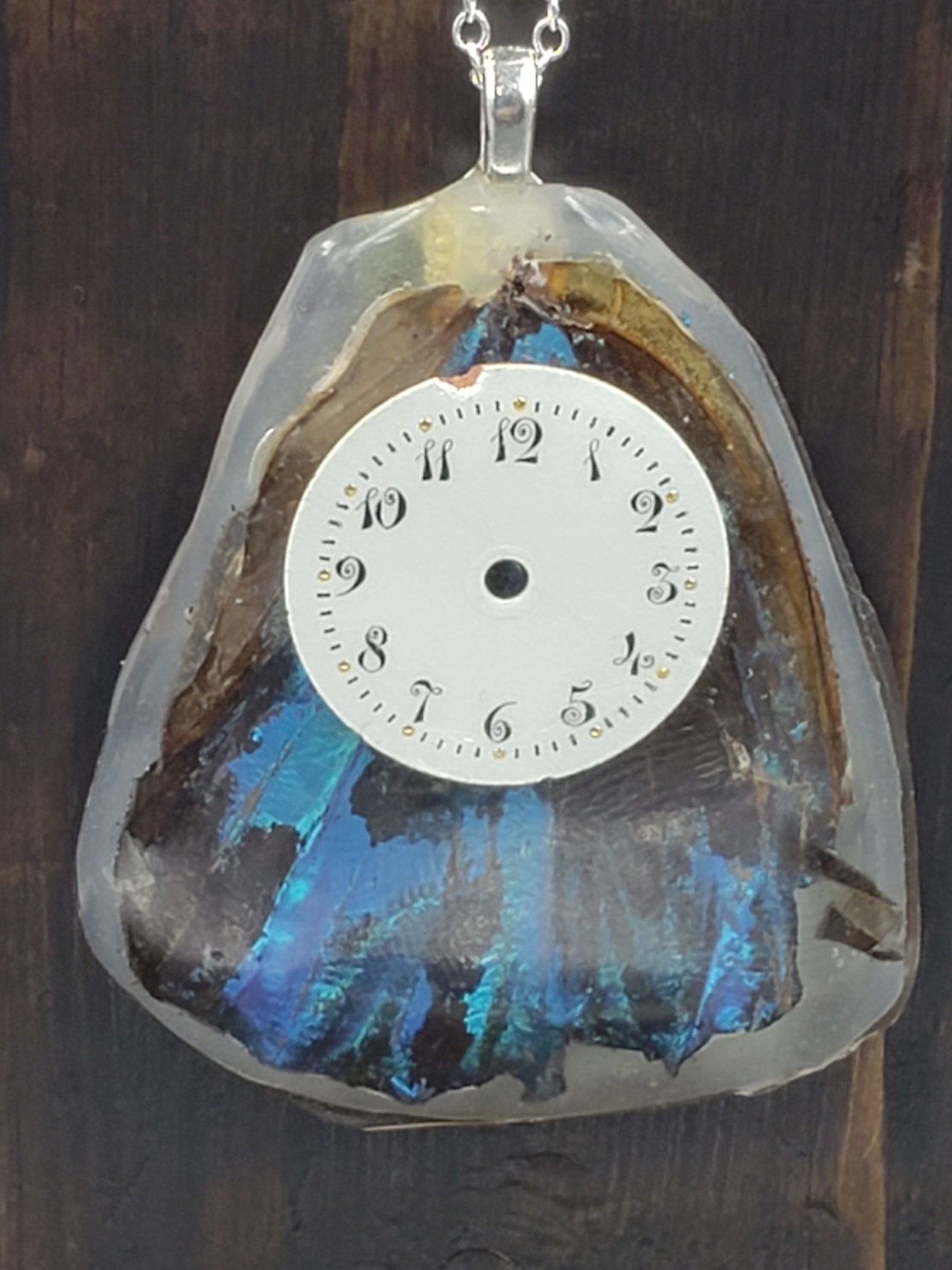 A small white dial is attached to the front of a Blue Morpho Butterfly wing, which has several coats of resin upon it. The resin protects the wing but also allows the scales of the wing to reflect the light in a fantastic way. This has a silver-plated bail on the back and a chain.
