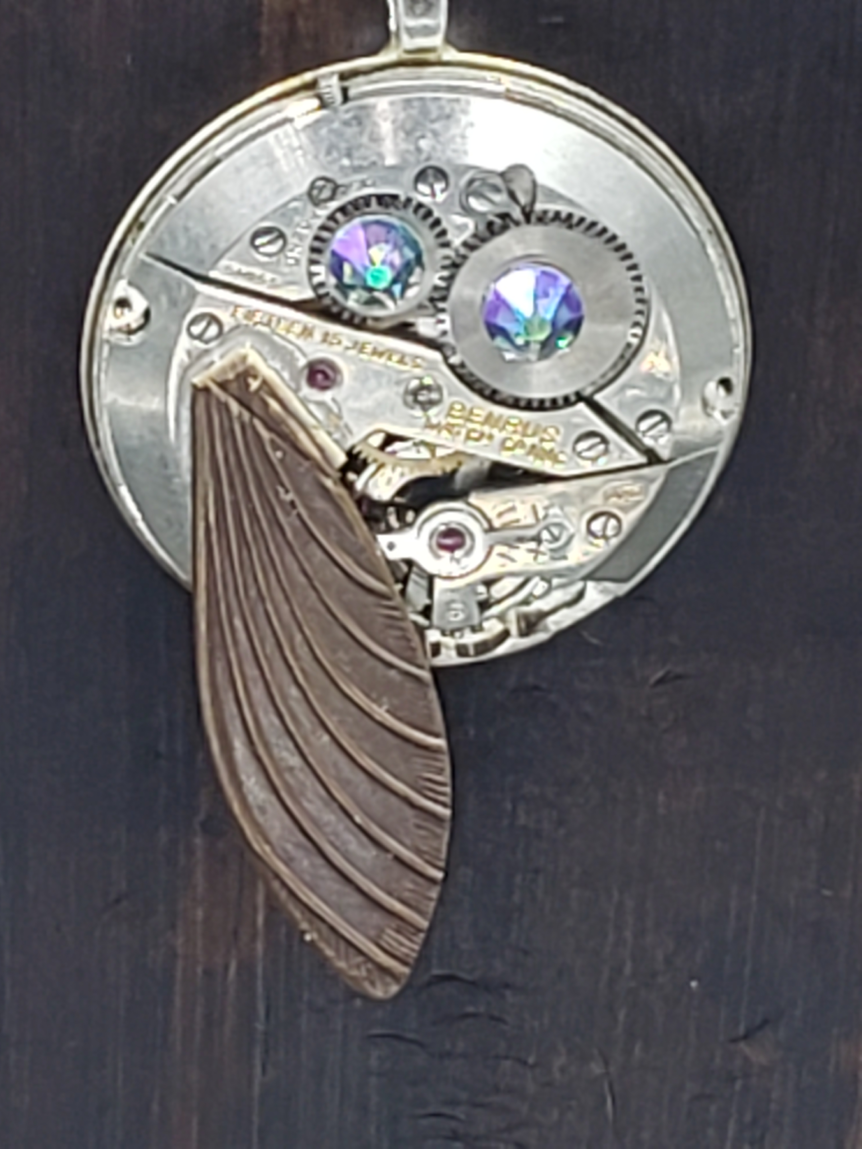 A smaller watch movement from the Benrus Watch Company has a serial number placing it with a production date between 1930 and 1945. The movement is complete with dial on the opposite side. There is a copper colored metal wing attached to one side and near the top is a pair of aurora colored Swarovski crystals. There is a silver-plated bail on the back and a chain.