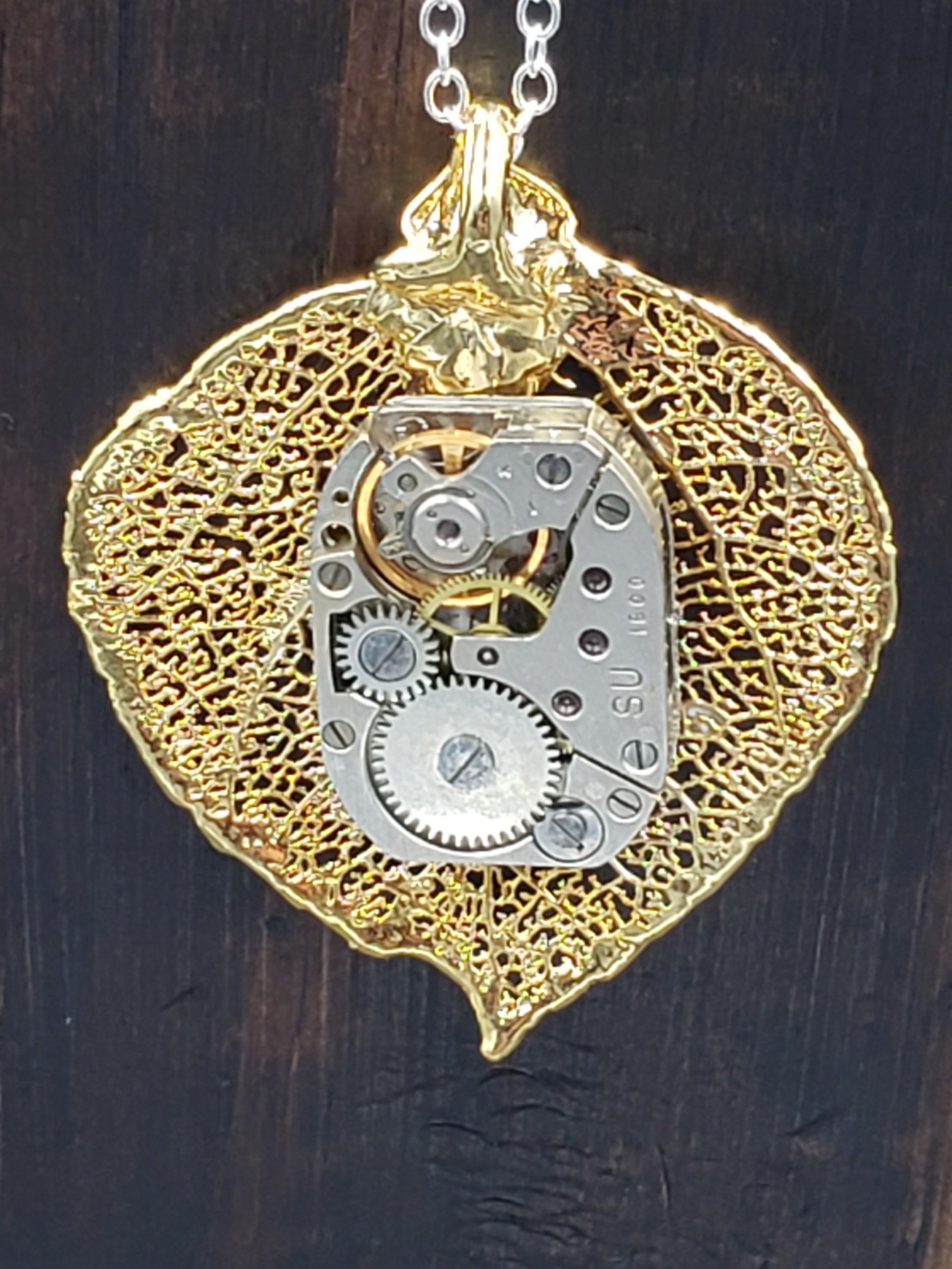 Next Previous Rectangle Watch on Gold Leaf by antiquariancouture March 25, 2024 All Jewelry, Pendants, Uncategorized antique, aspen, gold, industrial, leaf, movement, necklace, pendant, steam punk, steampunk, Victorian, vintage, watch This antique watch movement is attached to the front of a 22 K gold-plated Aspen leaf. This hangs with a gold-plated bail and a silver-plated chain. Share this: Click to share on X (Opens in new window) X More Click to share on Nextdoor (Opens in new window) Nextdoor Click to share on Facebook (Opens in new window) Facebook Click to share on Bluesky (Opens in new window) Bluesky Click to share on Threads (Opens in new window) Threads Like Loading... Related