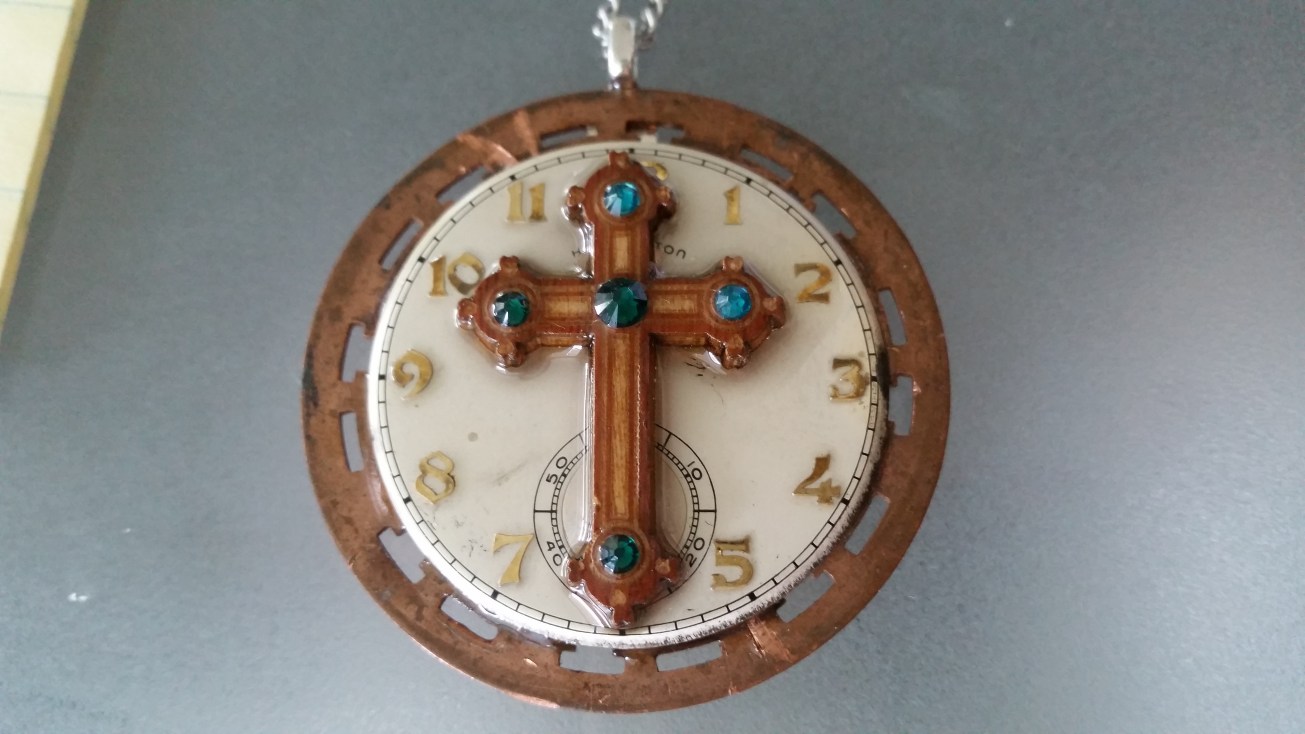 I first started to design and make jewelry in the middle of 2013 and at the time, it was very basic and simple things with which I had no idea how to price or sell. Eventually I learned, expanded and invested in better materials and items to make better and easier products. The above picture is a round piece of metal from some item, with an porcelain coated pocket watch dial and a wooden cross on top of that. That cross then has resin and Swarovski crystals and was arranged as a pendant.