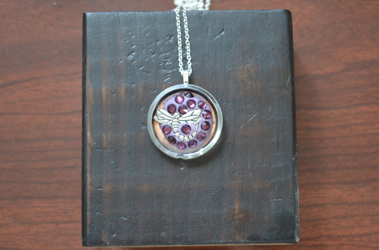 Some epoxy putty was mixed with a light purple color and sculpted into a circular shape. It was pressed inside of an old watch case. A silver plated dragonfly charm is inlaid into the putty and some purple colored Swarovski crystals were embedded as well. This hangs with a silver plated bail and chain.