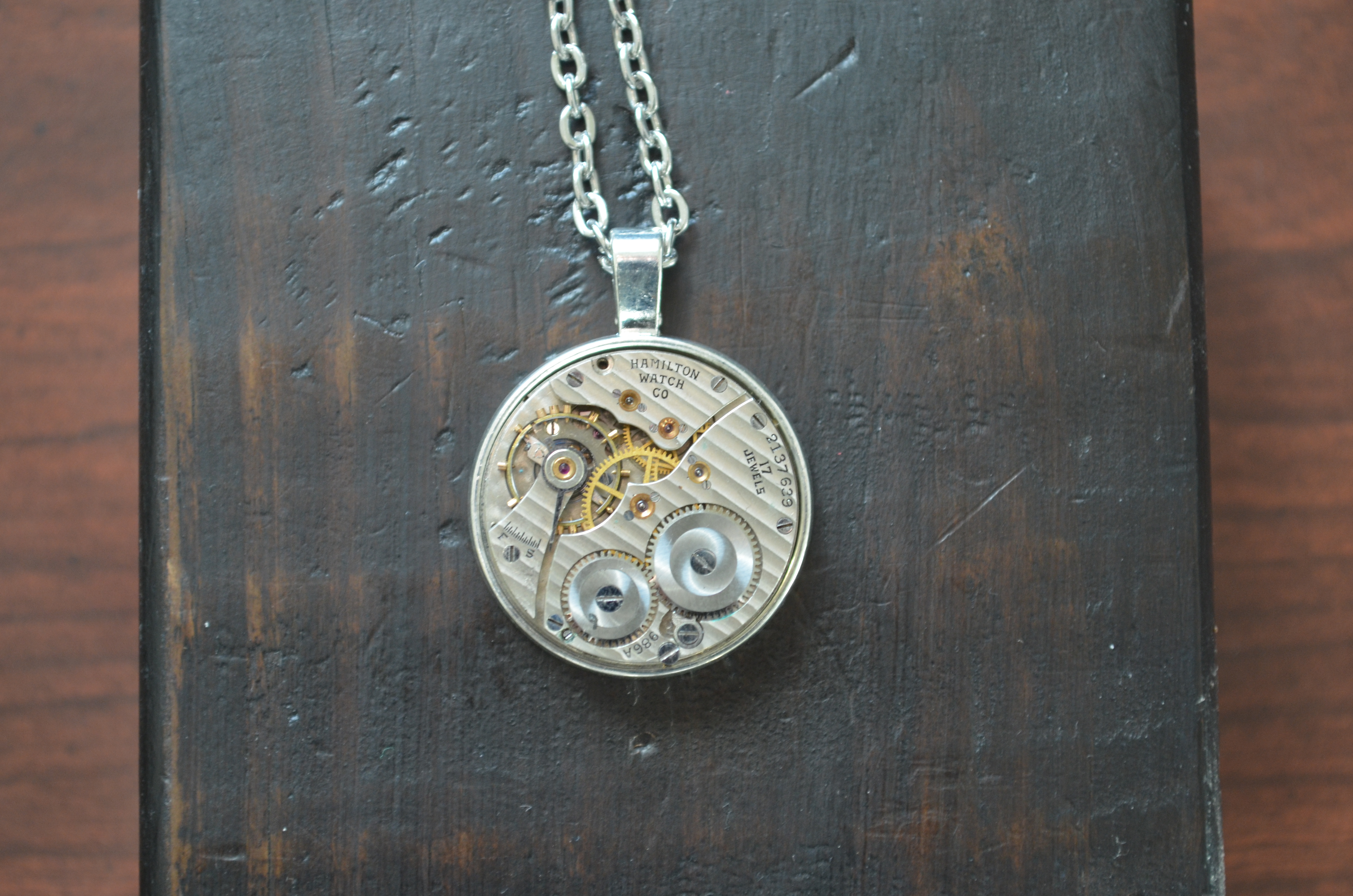 Sometimes I think that these antique watches look beautiful enough to be the star of the show. This is an antique watch made by the Hamilton Watch Company. The serial number on the side places it with a production year of 1924. This means that this watch piece is already over a hundred years old! This hangs in a silver plated bezel with a silver plated chain.