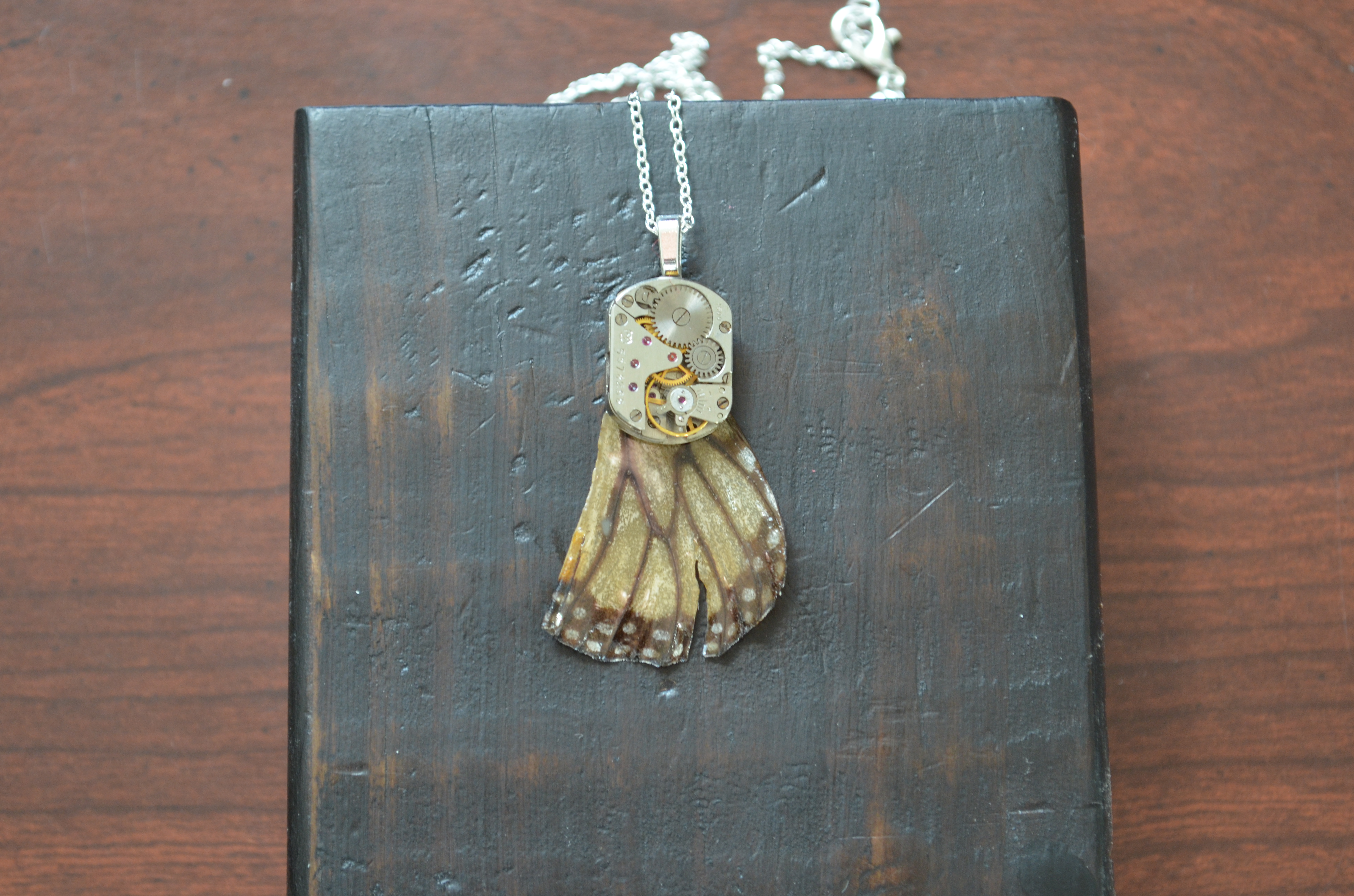 Next Previous Small watch on Monarch by antiquariancouture April 30, 2025 All Jewelry, Pendants, Uncategorized antique, butterfly, butterfly wings, industrial, jewelry, Monarch, movement, necklace, pendant, steam punk, Victorian, vintage, watch A resin coated Monarch butterfly wing has a small wrist watch movement attached to the top. This hangs with a silver plated bail and chain. Share this: Share on X (Opens in new window) X More Share on Nextdoor (Opens in new window) Nextdoor Share on Facebook (Opens in new window) Facebook Share on Bluesky (Opens in new window) Bluesky Share on Threads (Opens in new window) Threads Like Loading... Related