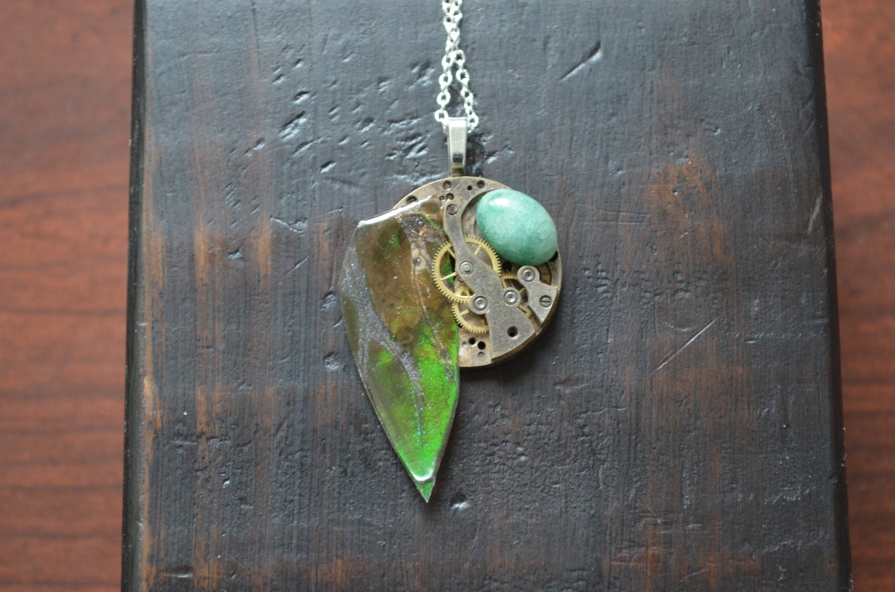 Next Previous Blue Morpho Wing with watch and emerald by antiquariancouture May 19, 2025 All Jewelry, Pendants, Uncategorized antique, blue morpho, butterfly, butterfly wing, emerald, gem, gemstone, industrial, jewelry, Morpho, movement, necklace, pendant, steam punk, steampunk, Victorian, vintage, watch A laminated Blue Morpho butterfly wing sits attached to one side of an antique watch movement. There is an oval shaped Emerald on the other side. This hangs with a silver plated bail and chain. Share this: Share on X (Opens in new window) X More Share on Nextdoor (Opens in new window) Nextdoor Share on Facebook (Opens in new window) Facebook Share on Bluesky (Opens in new window) Bluesky Share on Threads (Opens in new window) Threads Like Loading... Related