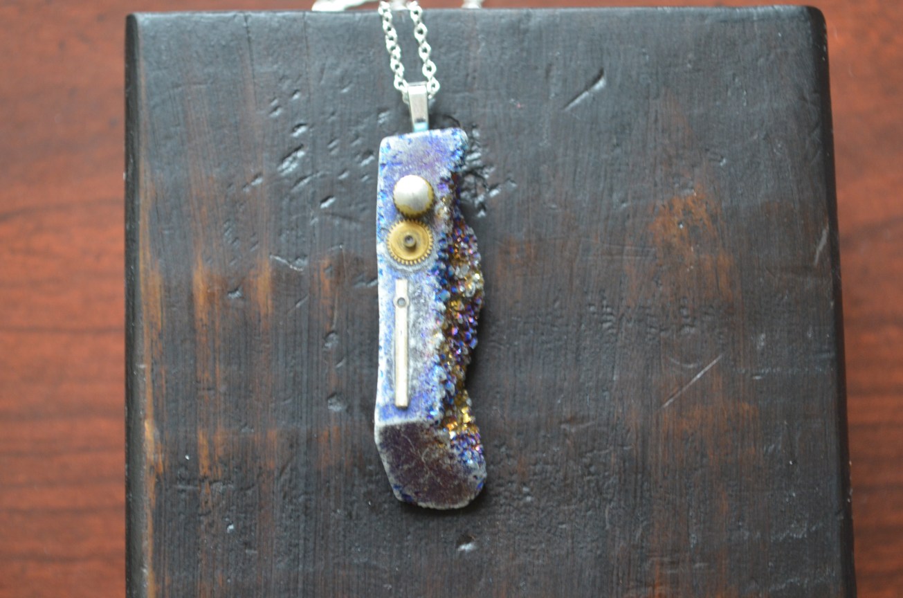 Next Previous Larger Druzy with gear and pieces by antiquariancouture May 30, 2025 All Jewelry, Pendants, Uncategorized antique, crystal, druzy, gear, gem, hand, industrial, jewelry, movement, necklace, pendant, steam punk, Victorian, vintage, watch The jeweled end of a watch stem, a gear and a hand for the dial are all attached to the front of a cut Druzy crystal piece. This hangs with a silver plated bail and chain. Share this: Share on X (Opens in new window) X More Share on Nextdoor (Opens in new window) Nextdoor Share on Facebook (Opens in new window) Facebook Share on Bluesky (Opens in new window) Bluesky Share on Threads (Opens in new window) Threads Like Loading... Related