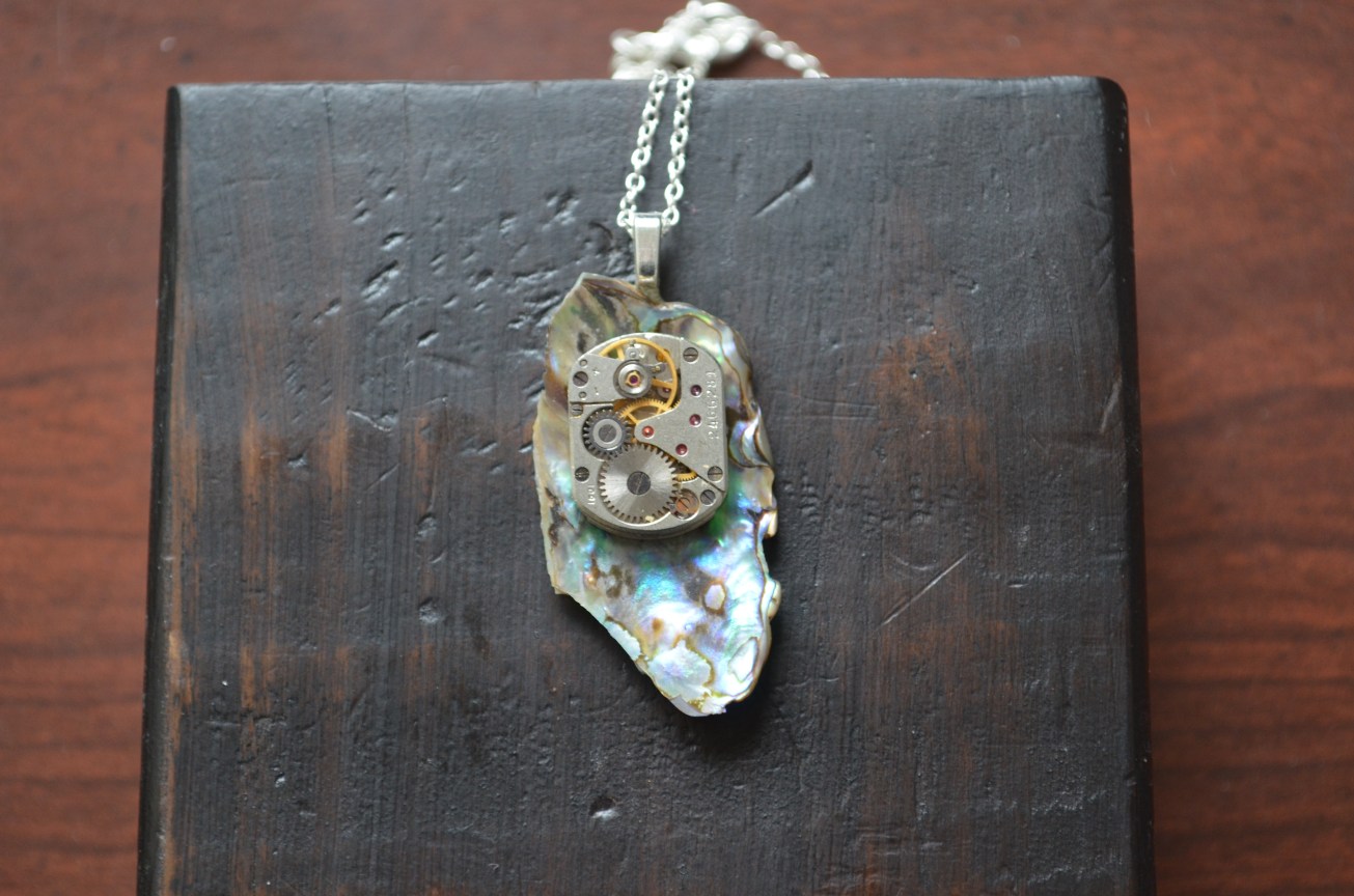 Next Previous Rectangular watch movement on Abalone shell by antiquariancouture June 11, 2025 All Jewelry, Pendants, Uncategorized abalone, antique, industrial, jewelry, movement, necklace, Paua, pendant, shell, steam punk, Victorian, vintage, watch This long piece of abalone shell has an antique watch movement attached to the front. This hangs with a silver plated bail and chain. Share this: Click to share on X (Opens in new window) X More Click to share on Nextdoor (Opens in new window) Nextdoor Click to share on Facebook (Opens in new window) Facebook Click to share on Bluesky (Opens in new window) Bluesky Click to share on Threads (Opens in new window) Threads Like Loading... Related