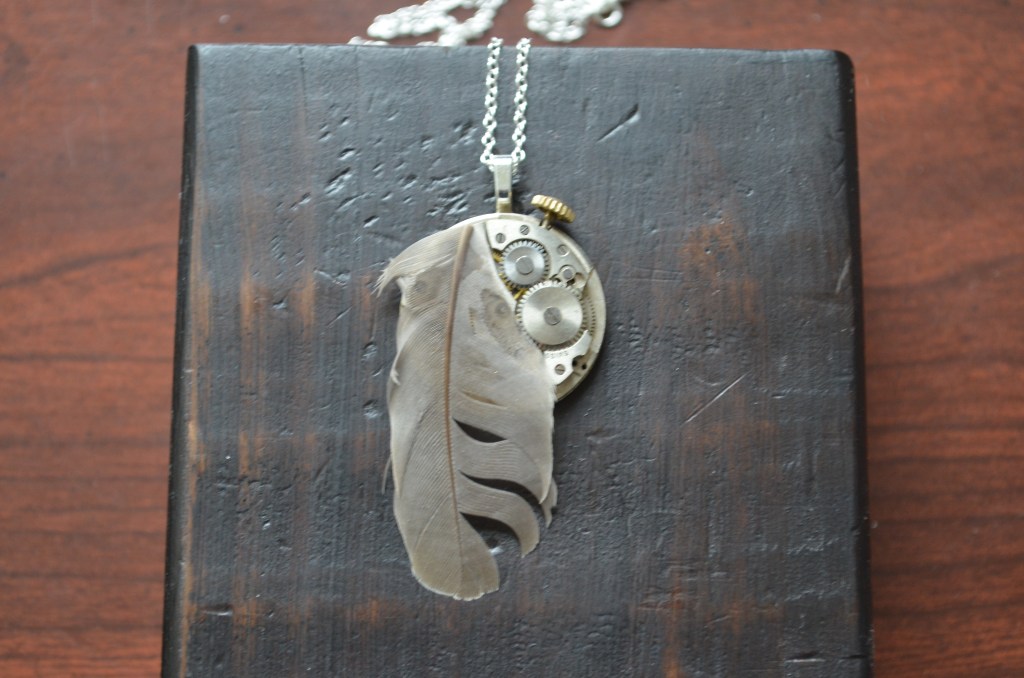Next Previous Found feather on movement by antiquariancouture July 4, 2025 All Jewelry, Pendants, Uncategorized antique, art, feather, industrial, jewelry, movement, necklace, pendant, steam punk, steampunk, Victorian, vintage, watch A feather found outside is attached to the front of this watch movement, with the winding stem still attached. This hangs with a silver-plated bail and chain. Share this: Click to share on X (Opens in new window) X More Click to share on Nextdoor (Opens in new window) Nextdoor Click to share on Facebook (Opens in new window) Facebook Click to share on Bluesky (Opens in new window) Bluesky Click to share on Threads (Opens in new window) Threads Like Loading... Related
