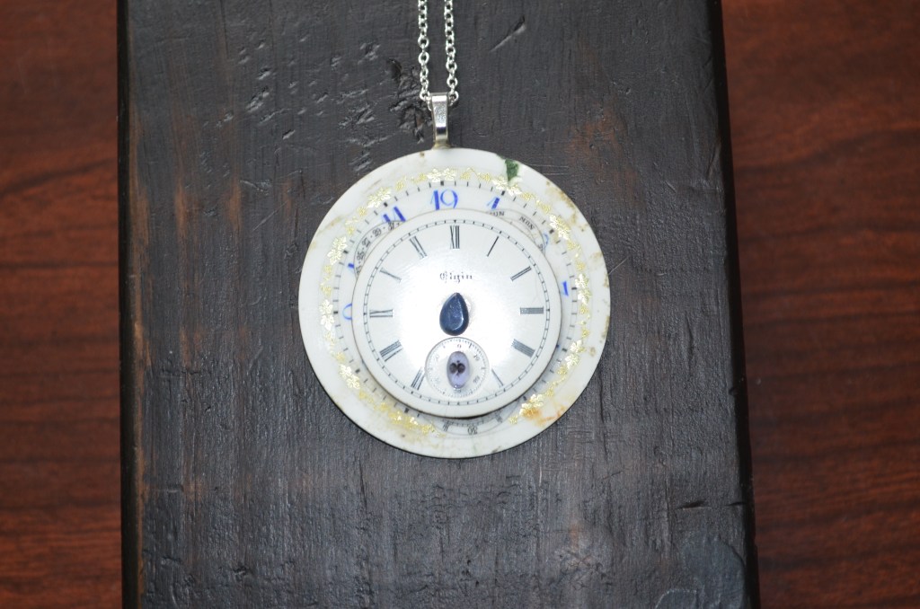 Decided to go with something fun and blue. This antique pocket watch dial, with all of the decoration and design, has a smaller dial attached to the front, made by the Elgin National Watch Company. The center of this dial has a pear-shaped Lapiz Lazuli piece and below that is an oval shaped piece of Sapphire. This hangs with a silver plated bail and chain.
