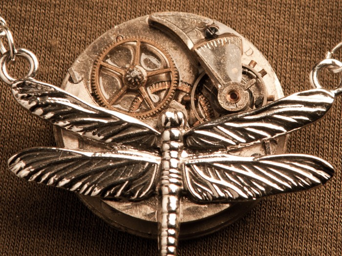 A watch movement made from the Columbia Watch Company in the 1930’s has a simple coat of resin on it. A metal dragonfly is spread on the front of this. This pendant hangs from a stainless steel chain.