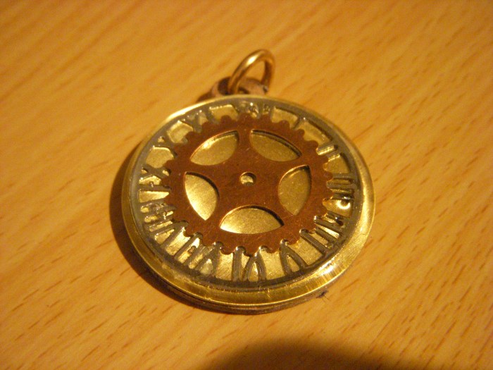 An antique pocket watch spring case, is attached to a metal, adjustable ring base. A gear is attached on top with a smaller gear in the middle.