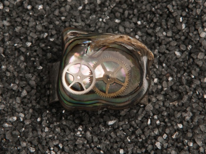 This is a pair of gears from an antique watch. They were set carefully in the middle of this Paua shell fragment. Resin coats it and traps it inside. This is then attached to an adjustable, metal ring.