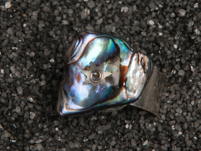 A star shaped gear, from an antique watch movement, is in the middle of a small piece of Paua shell. Then, a coat of resin covers it to protect it and seal it in. This whole piece is then attached to an adjustable metal ring […]