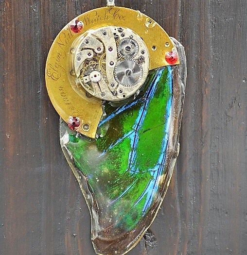A Blue Morpho butterfly wing has several coats of resin over it and has an antique pocket watch plate attached to the top. The plate was made by the Elgin National Watch Company in 1891. There is a smaller antique watch movement attached in the […]