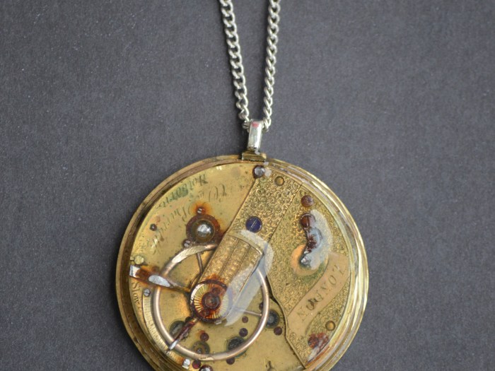 This is a watch movement made by the Hampden Watch Company, made in 1889 in Canton, Ohio. The movement was coated in resin and then three Swarovski crystals were attached to the top. There is a silver plated bail on the back.