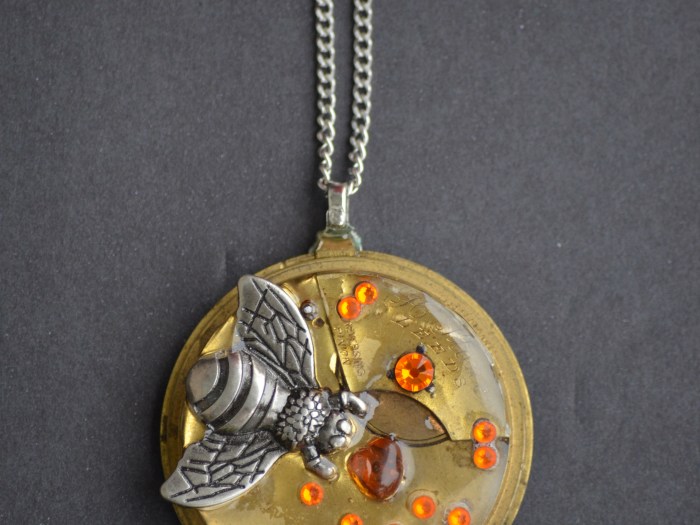 An antique pocket watch made in Leeds, England, in the early 1800’s, sits under a coat of resin. On top of that is a metal bumble bee and a piece of amber in the center. Twelve orange Swarovski crystals are on top of the movement. […]