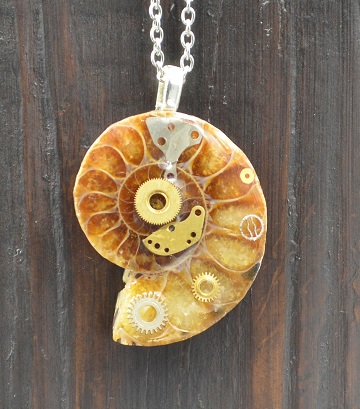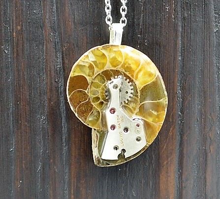 A 100 million year old Ammolite fossil rests with an antique watch plate piece attached to the top. There is a small gear and a calendar piece, attached near the center. This has a silver plated bail on the back and a silver plated chain.