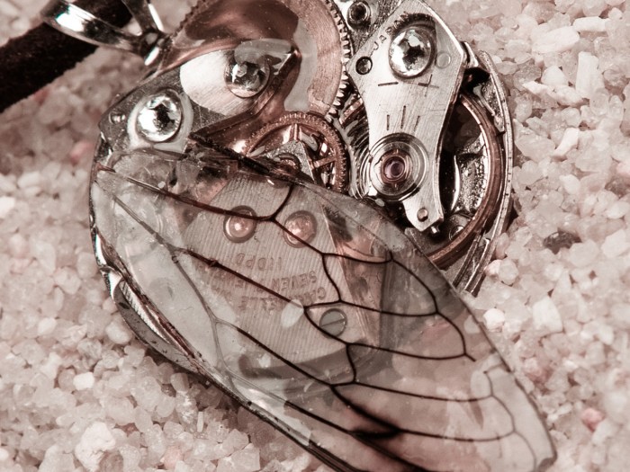 A giant Cicada wing, from Madagascar, sits under a coat of thin resin. Attached to the top side of the wing, are ten AB Swarovski crystals. There is also an antique watch movement from the Bijou Watch Company, made in the early 1900’s. This has […]