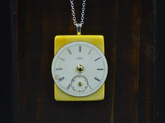 An antique yellow-colored stone bead is used as a backdrop for an Elgin National Watch Company dial. The porcelain coated copper dial has two Swarovski crystals attached to it. It has a silver-plated bail on the back and chain.