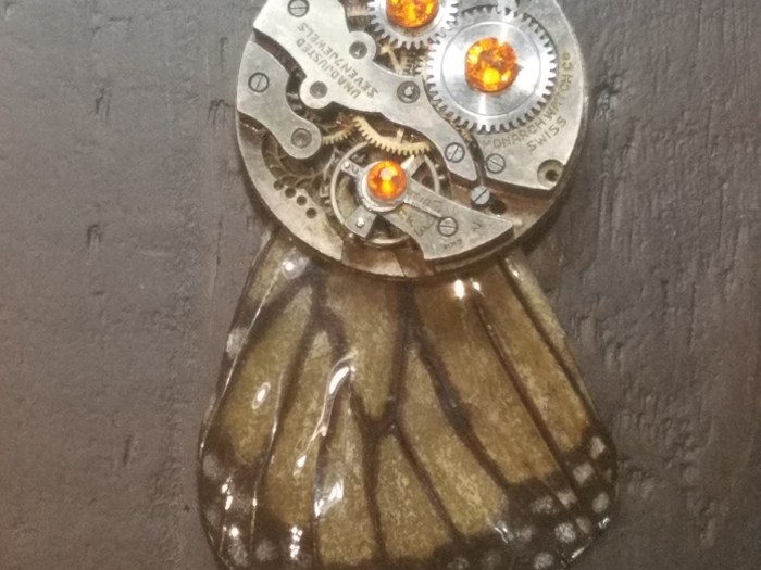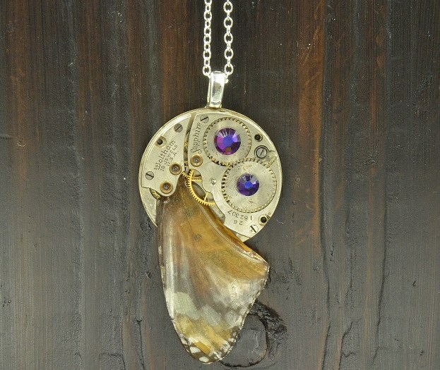 An antique Swiss watch movement, was coated in a thin layer of resin and attached to the top of a large butterfly wing; also coated in resin. There is a silver plated bail on the back.