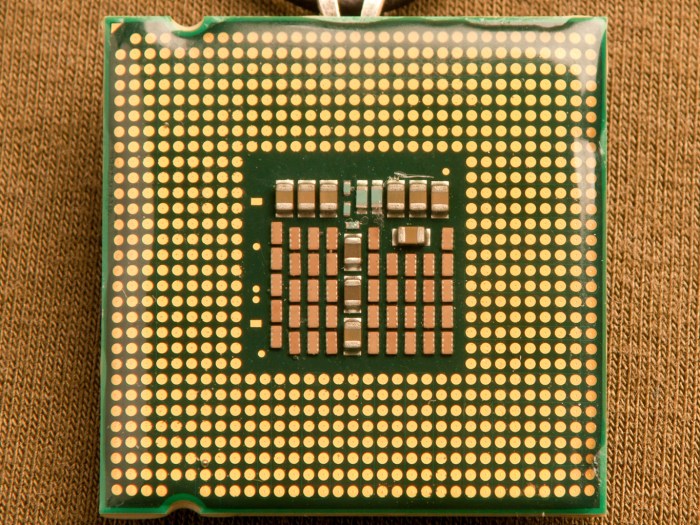 A Central Processing Unit from an old computer’s motherboard, was cut out and coated many times with smooth resin. This chip hangs from a black leather chord, meant to resemble electrical chord.