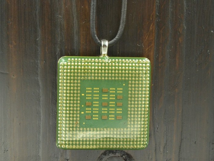 An older CPU has been carefully coated in resin and hangs with a silver plated bail and black leather chord.