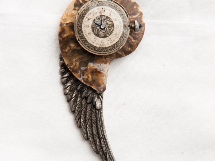 This necklace is made from an Ammonite fossil, which is between 252 and 66 million years old, attached to a metal wing on the back. An antique watch movement is attached to the front, in the center, and 3 orange Swarovski crystals are attached to […]