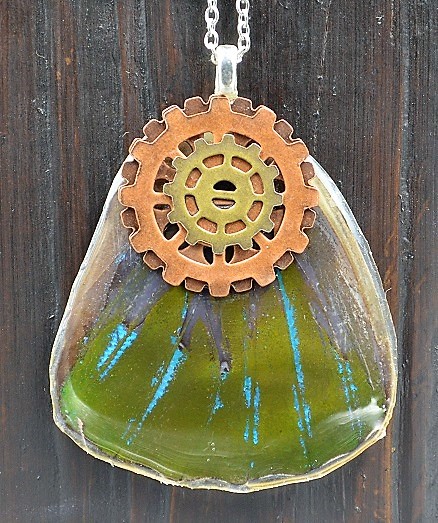 A necklace is made using a blue morpho butterfly wing which has several coats of resin. On the top side are 3 different sized metal gears, arranged so that they make a nice shape. There is a silver plated bail on the back and this […]