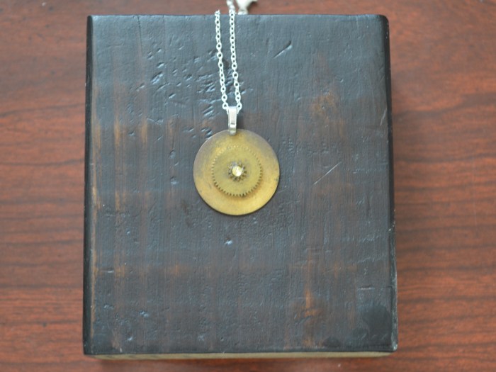 An antique pocket watch dial has a metal plate attached behind it. On top of it, is a larger gear from an antique mantle clock. This hangs with a silver plated bail and chain.