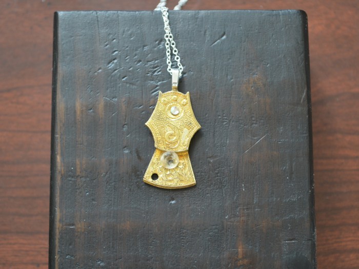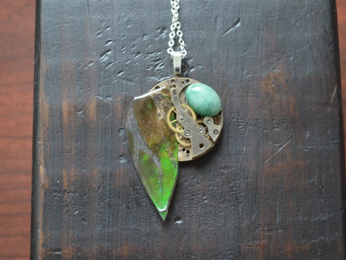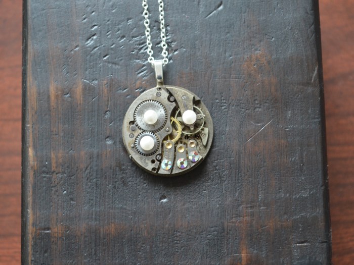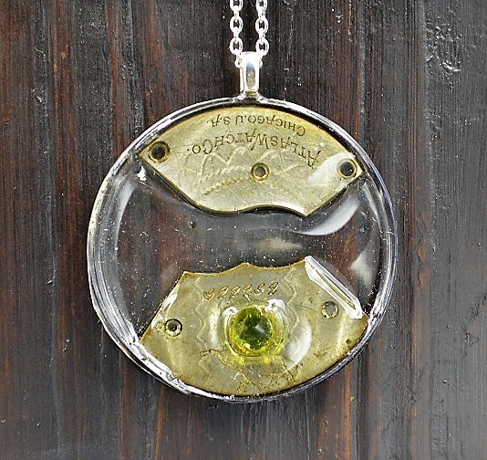 This was a difficult pendant to create. This uses two different watch movement plates and they are attached on the sides to an antique pocket watch spring. In the middle of these pieces, is several coats of resin. In the center of the bottom plate […]