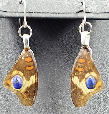 A pair of earrings was made by taking a pair of tiny butterfly wings and coat them in a thin coat of resin. On the front side of them, a pear shaped piece of lapis lazuli has been attached. They have a silver plated bail […]