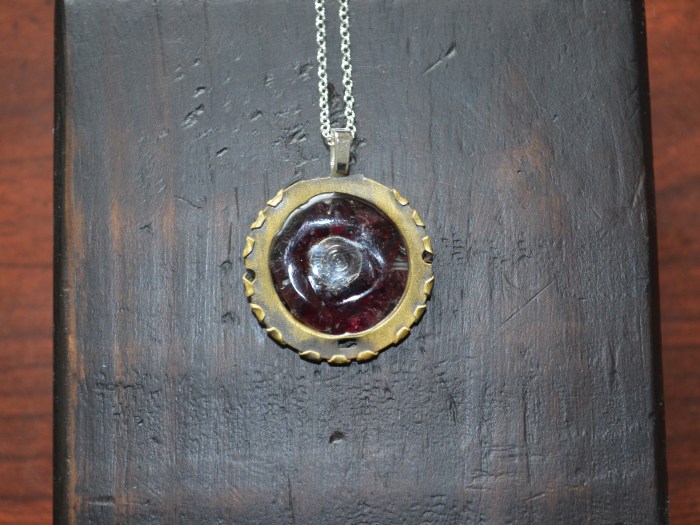 An antique watch locket piece has a layer of resin poured inside. The way that the resin cured, made it appear to be as a rose or another flower. This has many small pieces of Garnet gemstones inside. This hangs with a silver plated bail […]