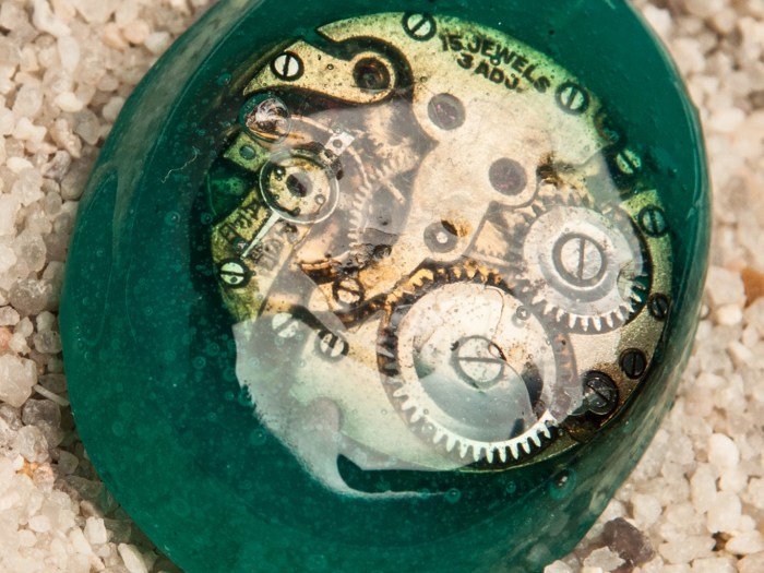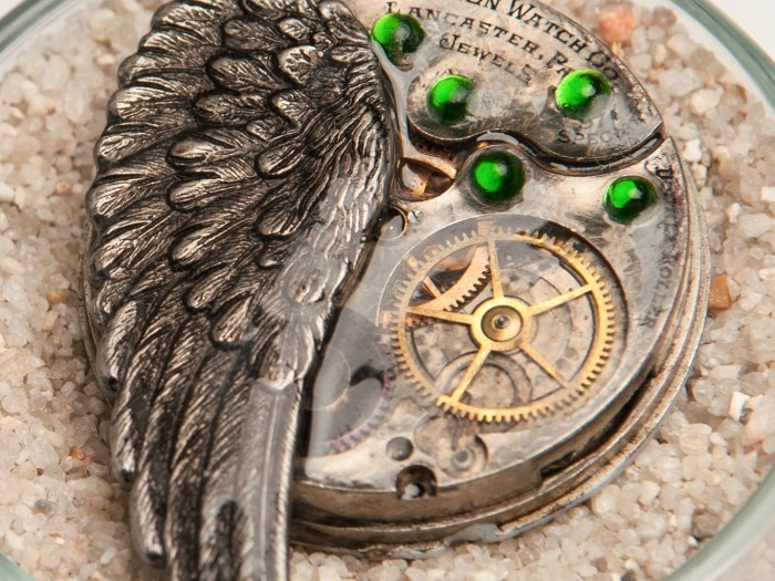 Two plates from antique watches rest on a larger back plate from an antique pocket watch. A spring case rests on the upper right side. A metal butterfly sits on the center. There is a large, green topaz placed in the top of the […]