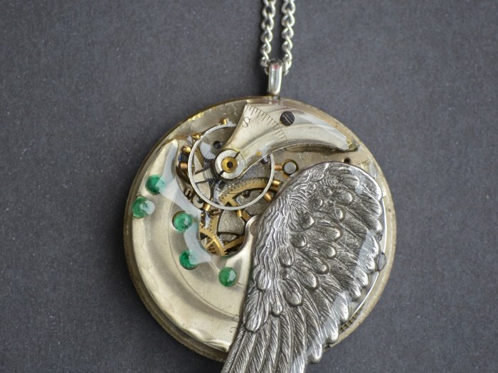 A large antique pocket watch from pre-1920’s, sits under a coat of resin with 5 small, round emeralds. A large metal wing is to the side. This hangs with a silver-plated bail and a stainless steel chain.