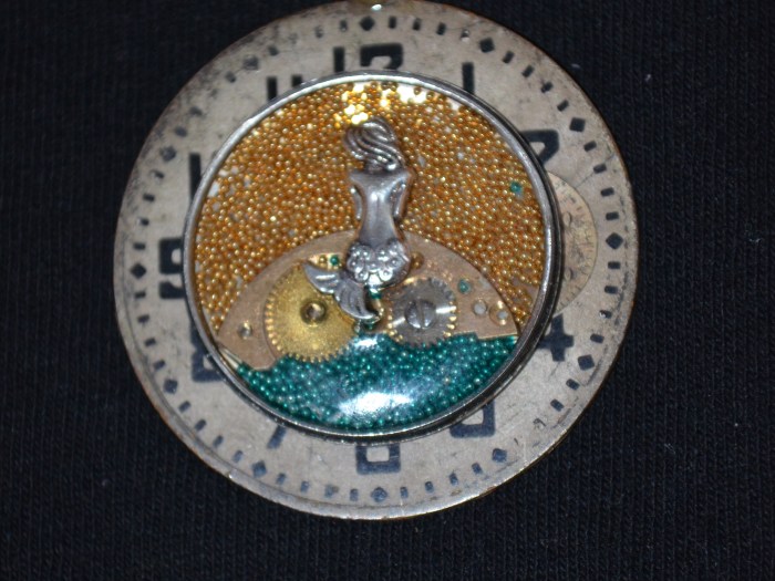 This pendant has been made using a pocket watch dial from the 1920’s as a base. A wristwatch case was then used to hold the gold colored and teal colored metal beads. A small watch movement plate acts like an island and a silver plated […]