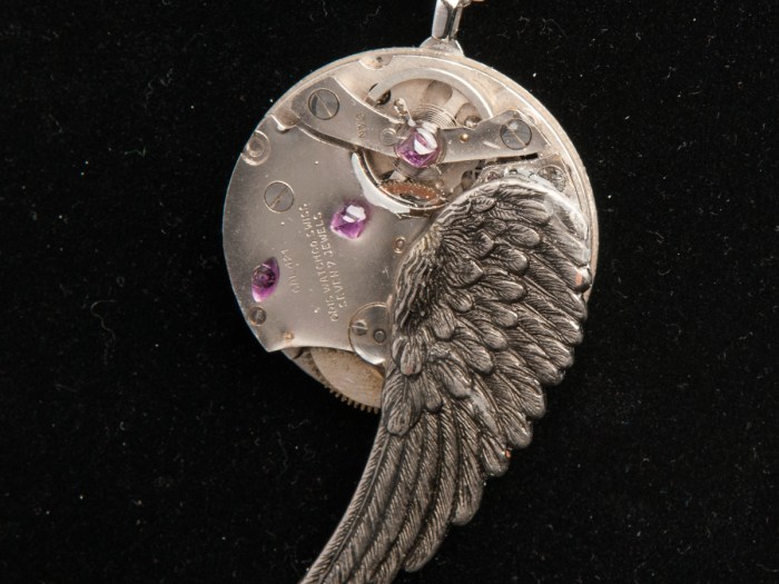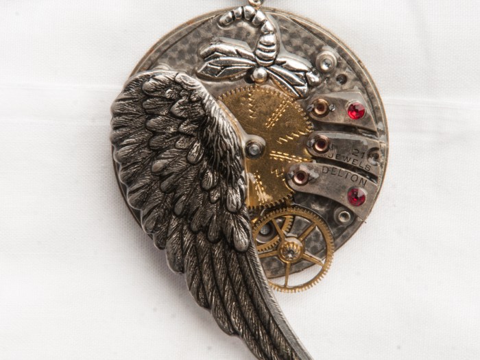 A pendant is made from an antique watch part, made by the American Waltham Watch Company, in 1888, sits at the top of this pendant. Below that piece, are two gears and to the right is a single, red Swarovski crystal. This pendant hangs from […]