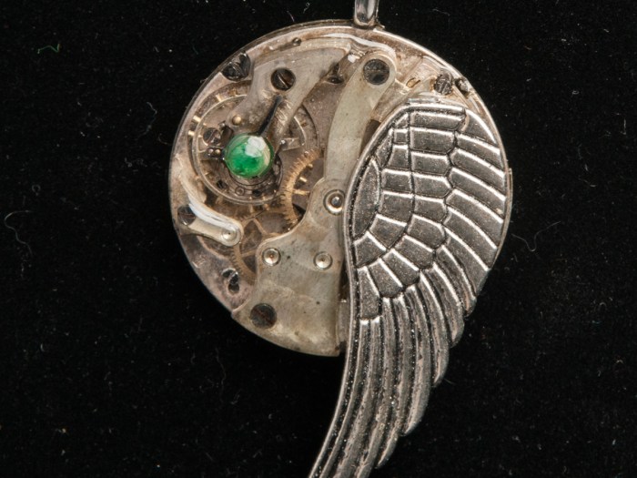 This pendant is made with an antique pocket watch movement with a metal wing on the side. A coat of resin covers everything. A single, round emerald is on the top of a gear movement. This hangs from a stainless steel chain.