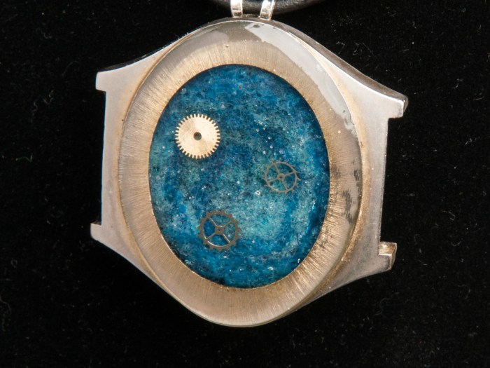 This pendant uses an antique pocket watch case and fills it with resin and items. There is a medium sized, Paua shell in the center along with a variety of tiny gears, wheels and cogs. This pendant still has the original watch dial on the […]