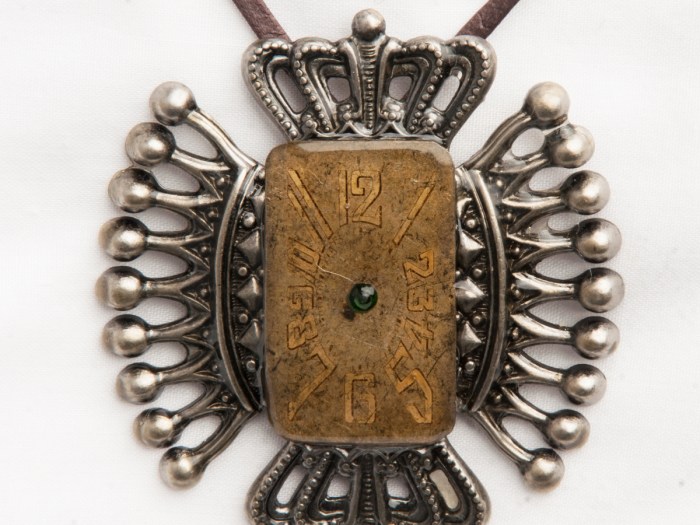 An antique, rectangle, watch dial, probably from the 1920’s, has a single green, Swarovski crystal in the center and a coat of resin over the rest. There are four metal crowns on the sides, under the dial. This is hung using a thin, brown leather […]