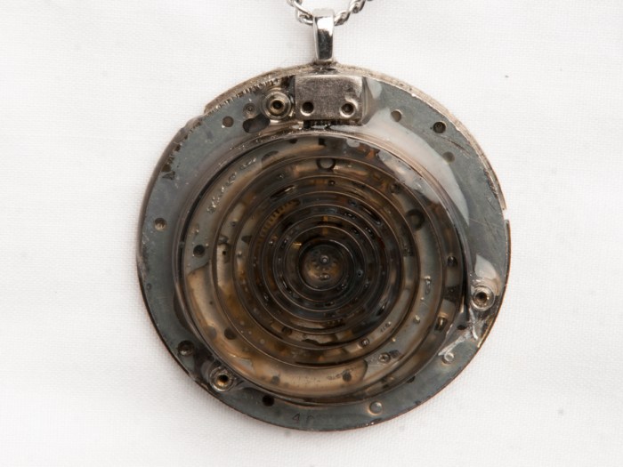 This is a pendant made by taking an antique, pocket watch backing and filling it with metal beads that are a colored in a mixture of pink and purple. These are coated with resin to make them smooth. Then, a plate from a “Dollar watch”, […]