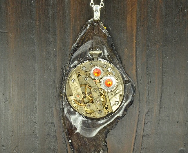 Tiny watch gears and wheels are on a Cicada wing with a clear coat of resin on top of that. This hangs with a silver-plated bail and a chain.