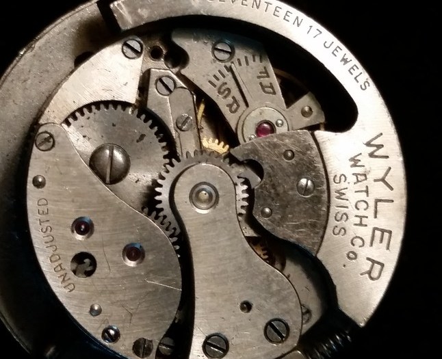 A watch movement made by the Wyler Watch company, was made before the 1960’s and is a bumper style, automatic watch movement. This has been attached to a metal, adjustable ring base.