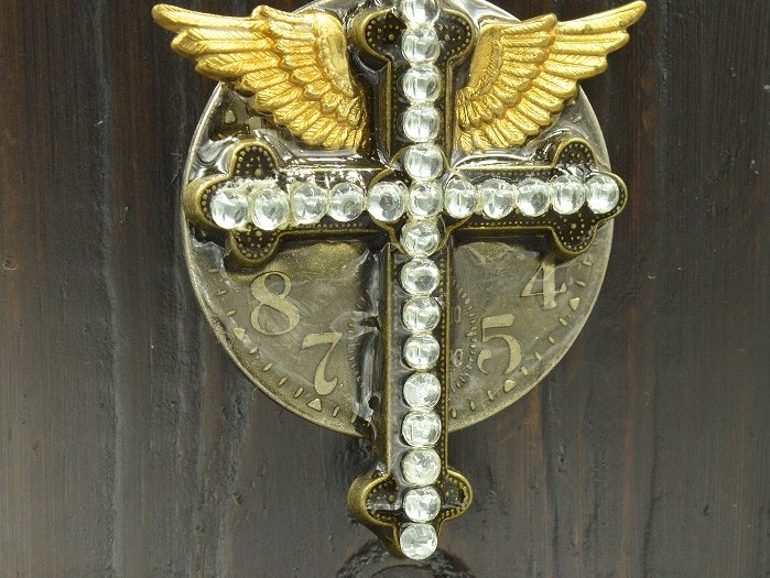 A metal watch face sits with a bronze, metal cross on top. Lining the center of the cross, are Swarovski crystals and resin. There are two gold-colored, metal wings at the top. This hangs with a braided leather chord.