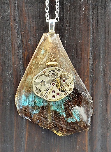 This necklace was made using the bottom wing portion of a blue Morpho butterfly. The wing has several layers of resin over it and it has an antique, gold-colored, metal watch dial, attached to the top. There is a thin coat of resin over the […]